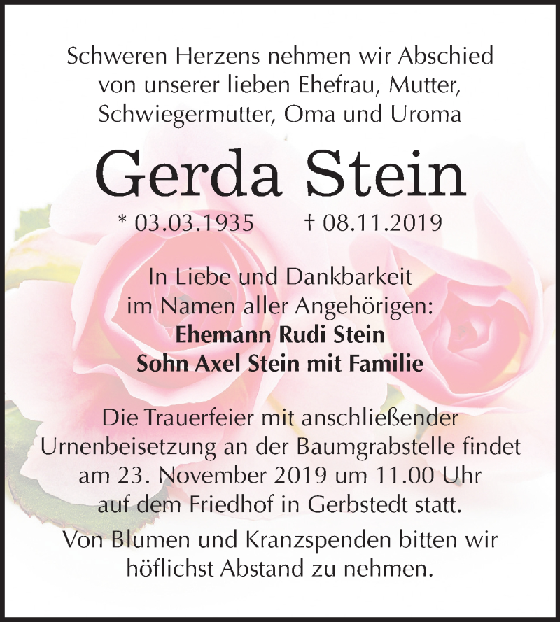 Hier finden Sie alle Traueranzeigen aus der Zeitung, die bisher für Gerda Stein erschienen sind. Weitere Traueranzeigen, die in der Zeitung erscheinen, werden hier ebenfalls aufgelistet
