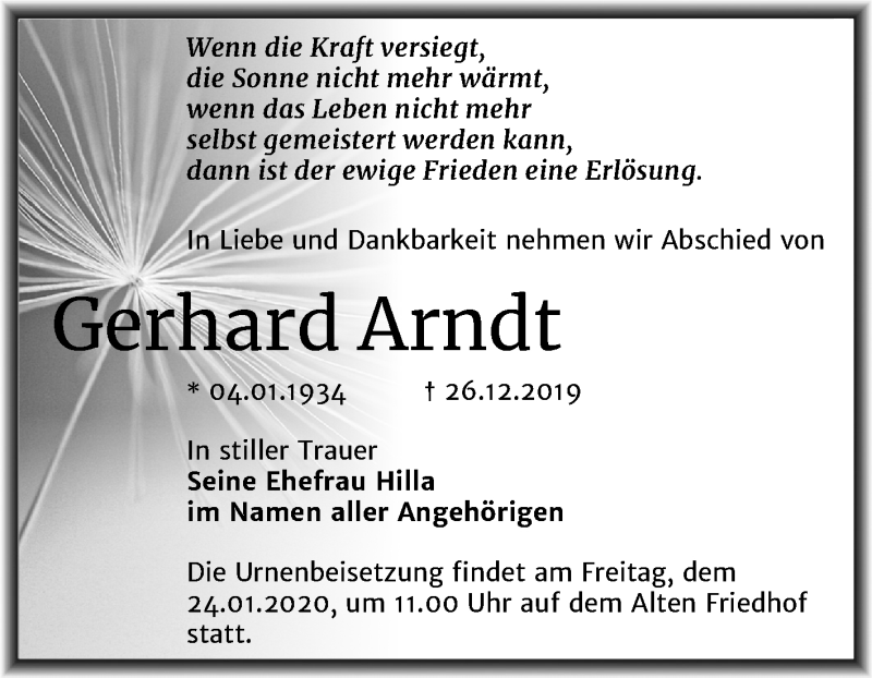 Hier finden Sie alle Traueranzeigen aus der Zeitung, die bisher für Gerhard Arndt erschienen sind. Weitere Traueranzeigen, die in der Zeitung erscheinen, werden hier ebenfalls aufgelistet