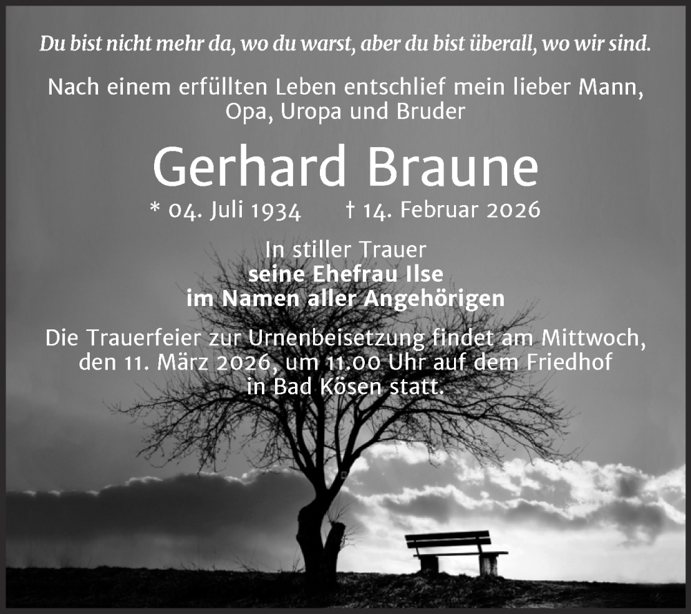 Hier finden Sie alle Traueranzeigen aus der Zeitung, die bisher für Gerhard Braune erschienen sind. Weitere Traueranzeigen, die in der Zeitung erscheinen, werden hier ebenfalls aufgelistet