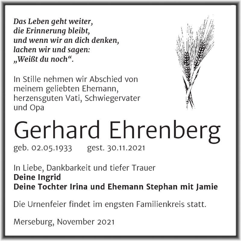 Hier finden Sie alle Traueranzeigen aus der Zeitung, die bisher für Gerhard Ehrenberg erschienen sind. Weitere Traueranzeigen, die in der Zeitung erscheinen, werden hier ebenfalls aufgelistet
