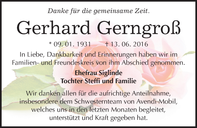 Hier finden Sie alle Traueranzeigen aus der Zeitung, die bisher für Gerhard Gerngroß erschienen sind. Weitere Traueranzeigen, die in der Zeitung erscheinen, werden hier ebenfalls aufgelistet