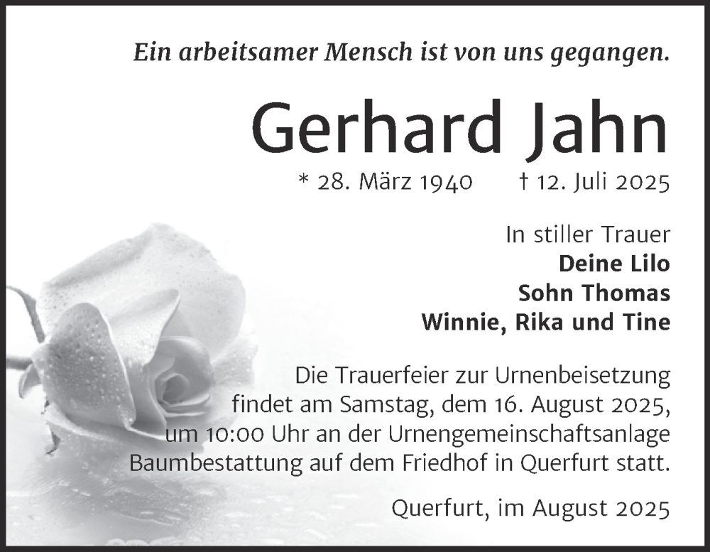 Hier finden Sie alle Traueranzeigen aus der Zeitung, die bisher für Gerhard Jahn erschienen sind. Weitere Traueranzeigen, die in der Zeitung erscheinen, werden hier ebenfalls aufgelistet