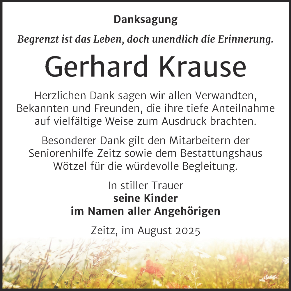 Hier finden Sie alle Traueranzeigen aus der Zeitung, die bisher für Gerhard Krause erschienen sind. Weitere Traueranzeigen, die in der Zeitung erscheinen, werden hier ebenfalls aufgelistet