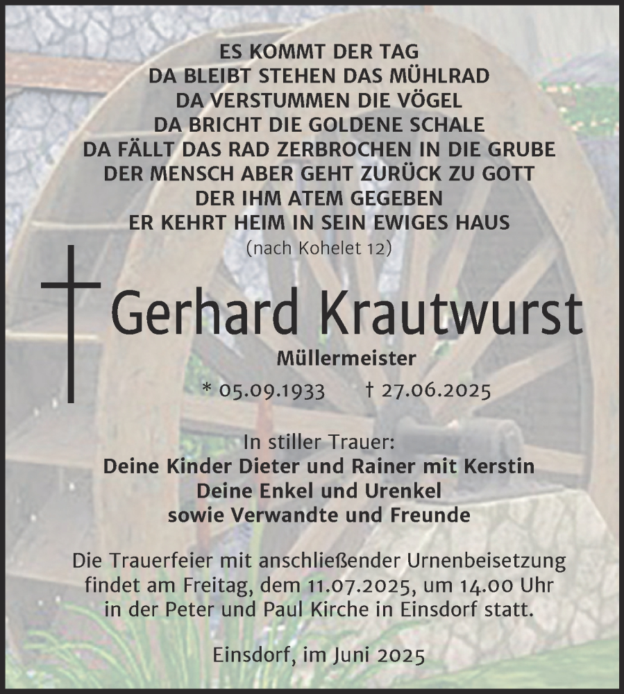 Hier finden Sie alle Traueranzeigen aus der Zeitung, die bisher für Gerhard Krautwurst erschienen sind. Weitere Traueranzeigen, die in der Zeitung erscheinen, werden hier ebenfalls aufgelistet