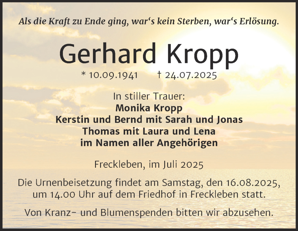 Hier finden Sie alle Traueranzeigen aus der Zeitung, die bisher für Gerhard Kropp erschienen sind. Weitere Traueranzeigen, die in der Zeitung erscheinen, werden hier ebenfalls aufgelistet