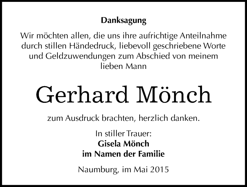 Hier finden Sie alle Traueranzeigen aus der Zeitung, die bisher für Gerhard Mönch erschienen sind. Weitere Traueranzeigen, die in der Zeitung erscheinen, werden hier ebenfalls aufgelistet