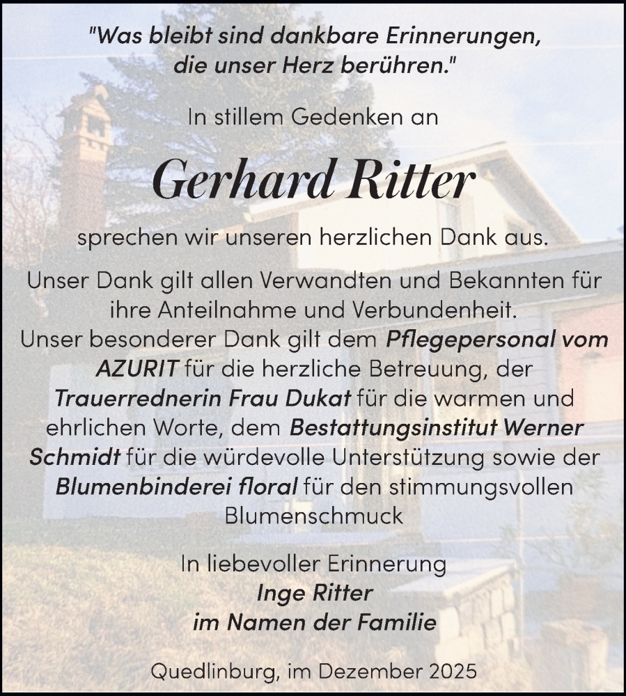 Hier finden Sie alle Traueranzeigen aus der Zeitung, die bisher für Gerhard Ritter erschienen sind. Weitere Traueranzeigen, die in der Zeitung erscheinen, werden hier ebenfalls aufgelistet