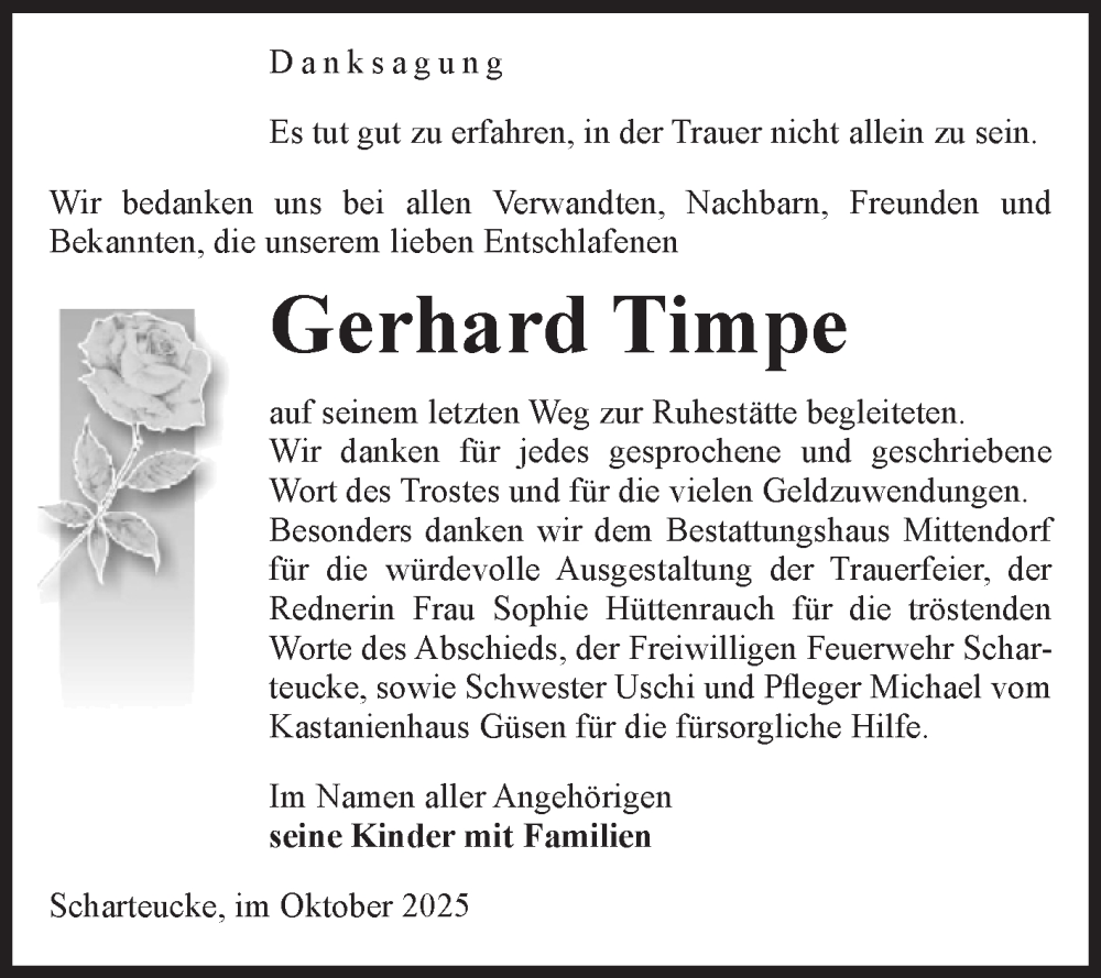 Hier finden Sie alle Traueranzeigen aus der Zeitung, die bisher für Gerhard Timpe erschienen sind. Weitere Traueranzeigen, die in der Zeitung erscheinen, werden hier ebenfalls aufgelistet