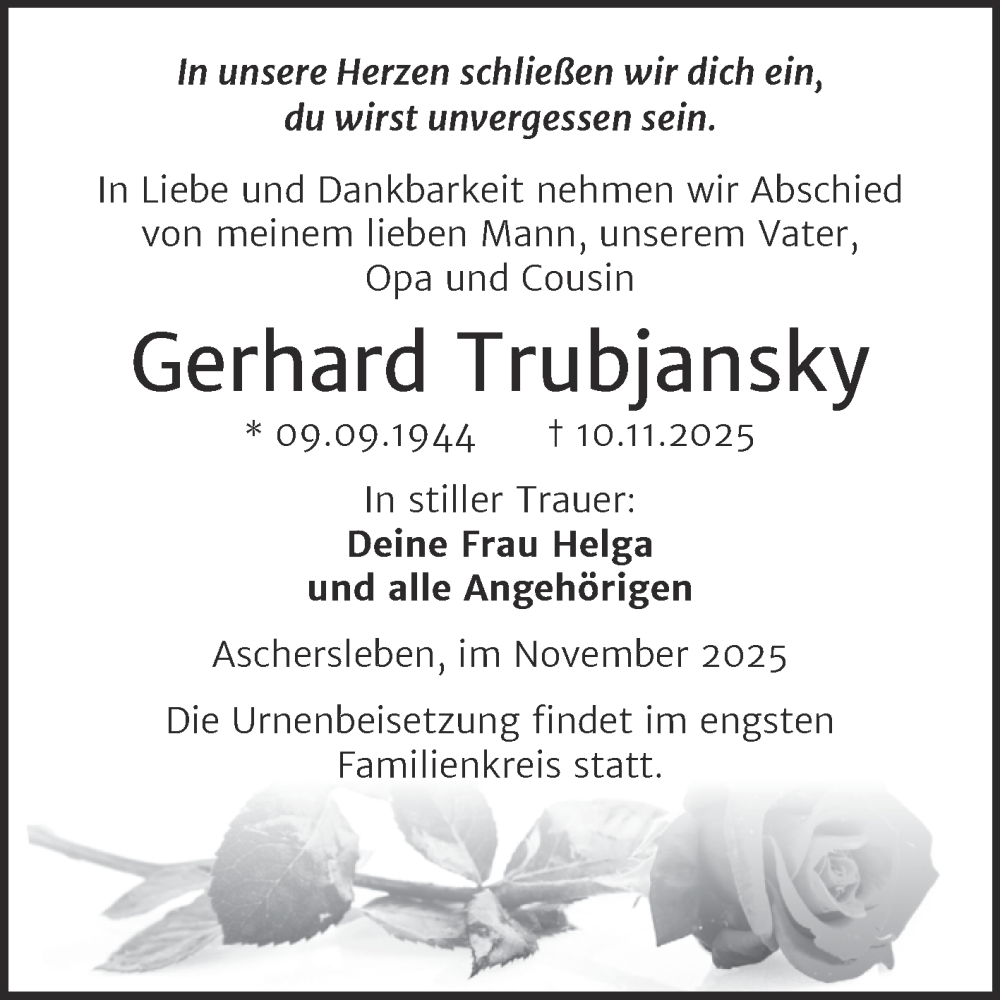 Hier finden Sie alle Traueranzeigen aus der Zeitung, die bisher für Gerhard Trubjansky erschienen sind. Weitere Traueranzeigen, die in der Zeitung erscheinen, werden hier ebenfalls aufgelistet