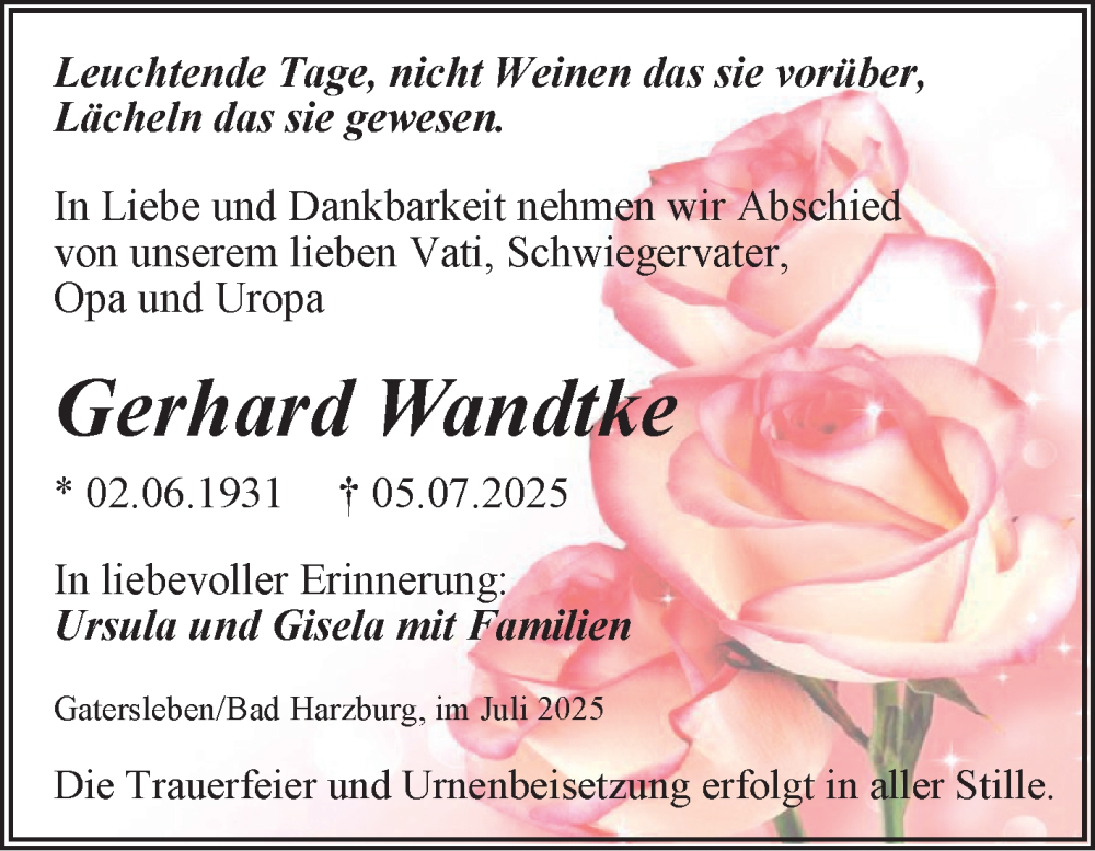 Hier finden Sie alle Traueranzeigen aus der Zeitung, die bisher für Gerhard Wandtke erschienen sind. Weitere Traueranzeigen, die in der Zeitung erscheinen, werden hier ebenfalls aufgelistet