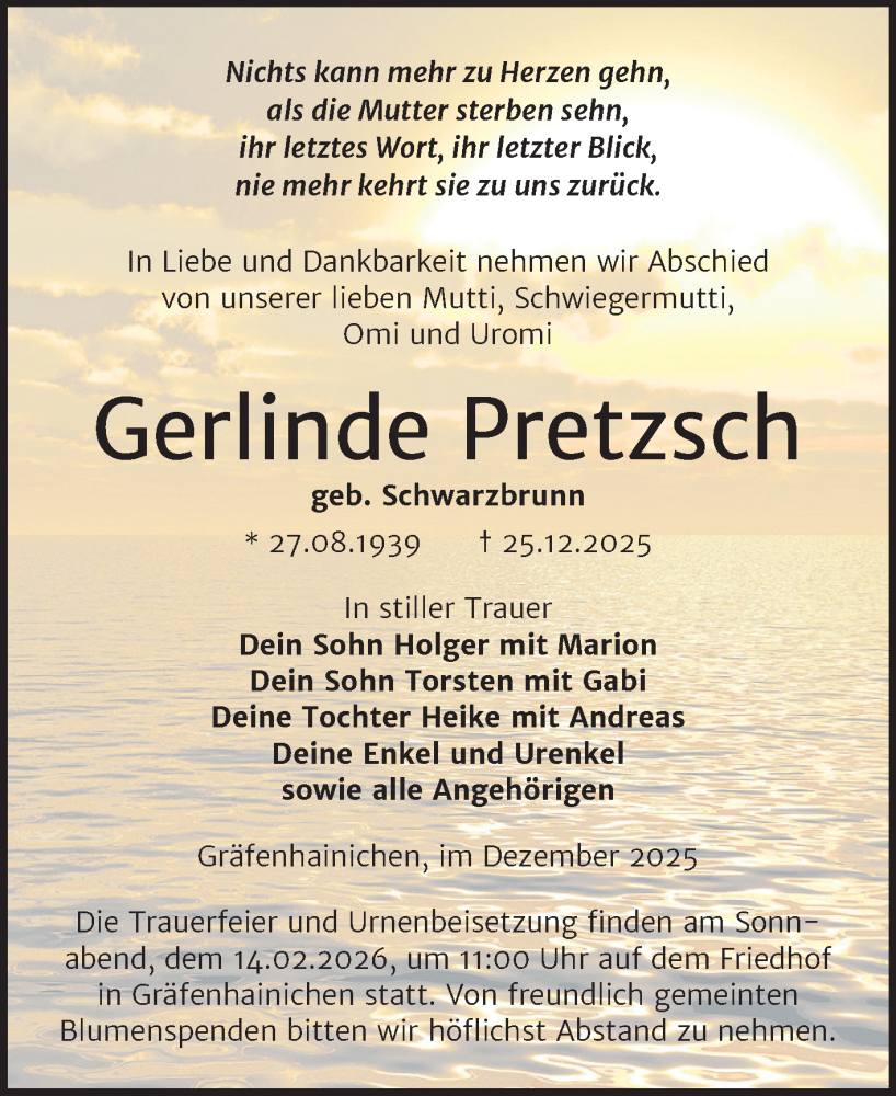Hier finden Sie alle Traueranzeigen aus der Zeitung, die bisher für Gerlinde Pretzsch erschienen sind. Weitere Traueranzeigen, die in der Zeitung erscheinen, werden hier ebenfalls aufgelistet