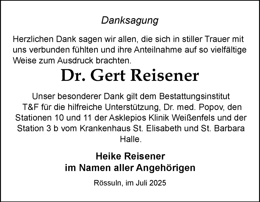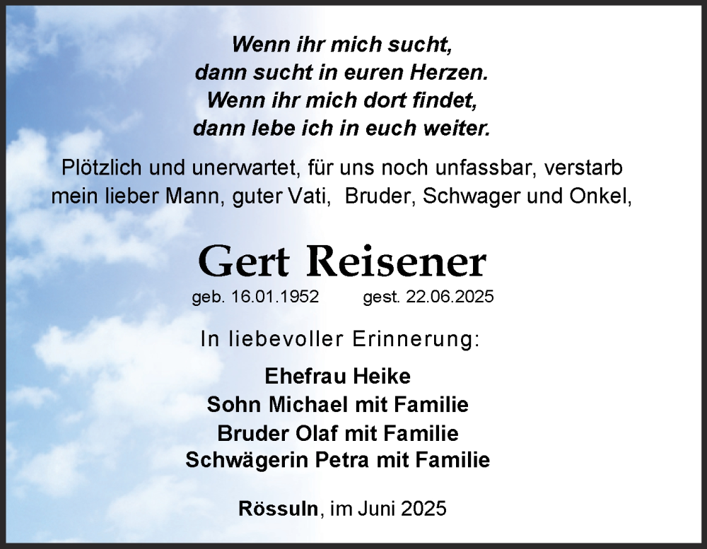 Hier finden Sie alle Traueranzeigen aus der Zeitung, die bisher für Gert Reisener erschienen sind. Weitere Traueranzeigen, die in der Zeitung erscheinen, werden hier ebenfalls aufgelistet