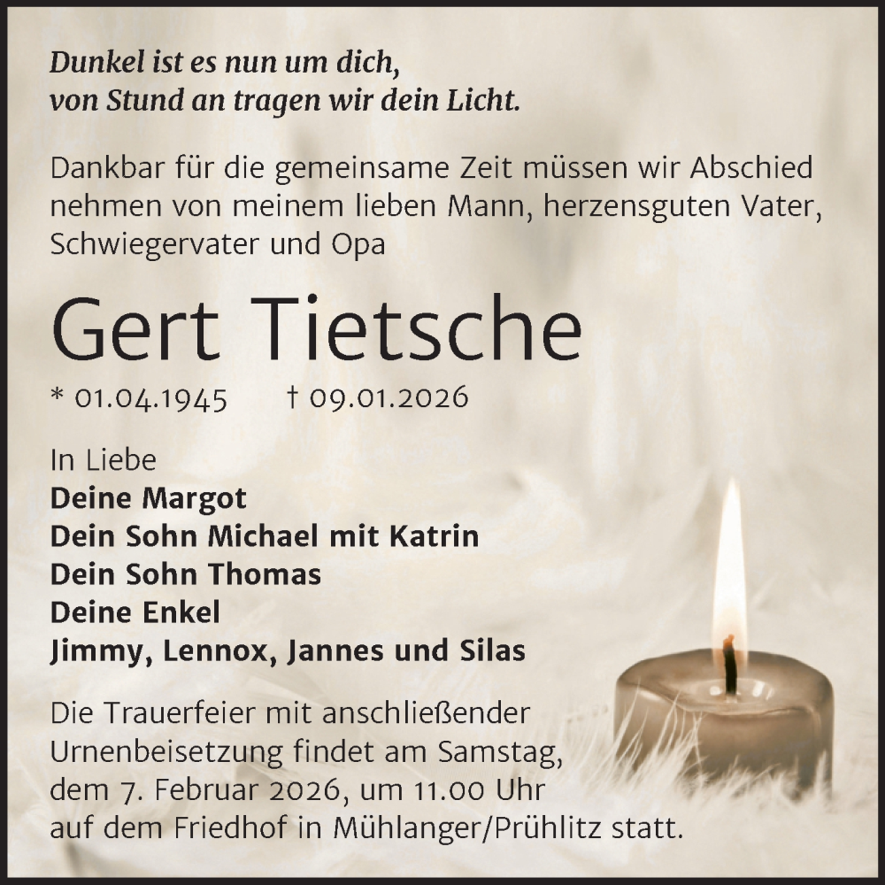 Hier finden Sie alle Traueranzeigen aus der Zeitung, die bisher für Gert Tietsche erschienen sind. Weitere Traueranzeigen, die in der Zeitung erscheinen, werden hier ebenfalls aufgelistet