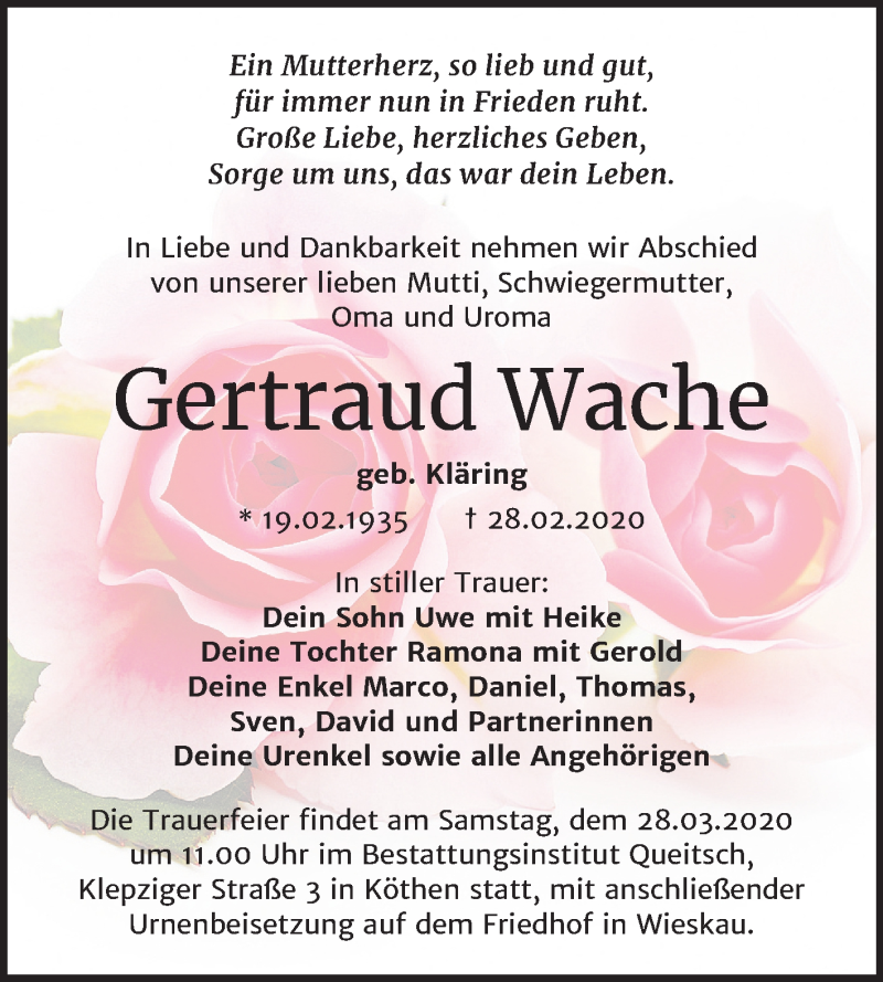 Hier finden Sie alle Traueranzeigen aus der Zeitung, die bisher für Gertraud Wache erschienen sind. Weitere Traueranzeigen, die in der Zeitung erscheinen, werden hier ebenfalls aufgelistet