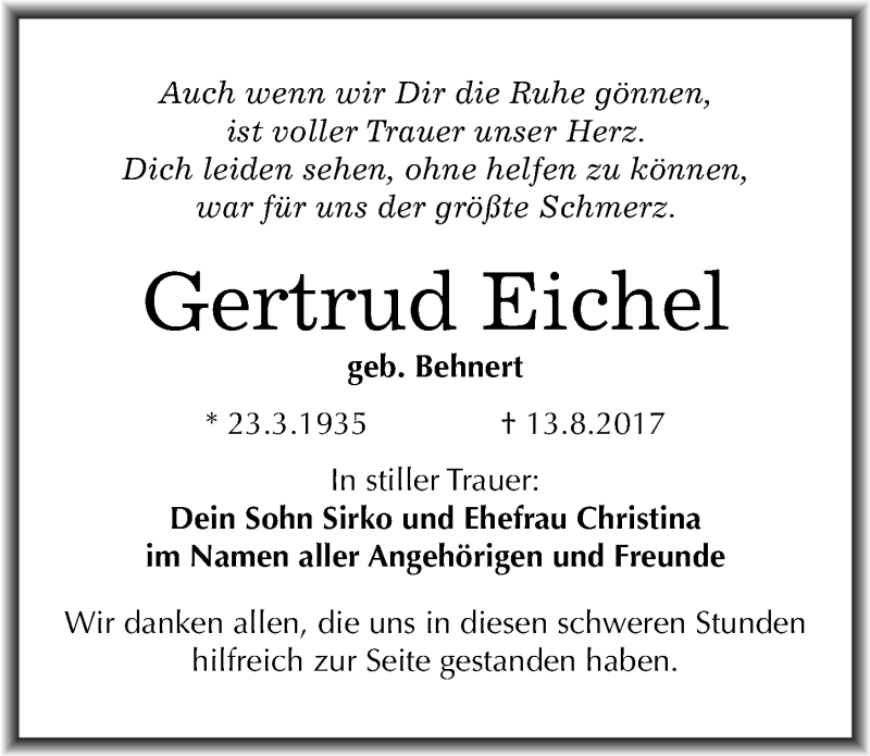 Hier finden Sie alle Traueranzeigen aus der Zeitung, die bisher für Gertrud Eichel erschienen sind. Weitere Traueranzeigen, die in der Zeitung erscheinen, werden hier ebenfalls aufgelistet