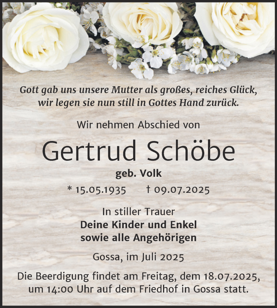 Hier finden Sie alle Traueranzeigen aus der Zeitung, die bisher für Gertrud Schöbe erschienen sind. Weitere Traueranzeigen, die in der Zeitung erscheinen, werden hier ebenfalls aufgelistet