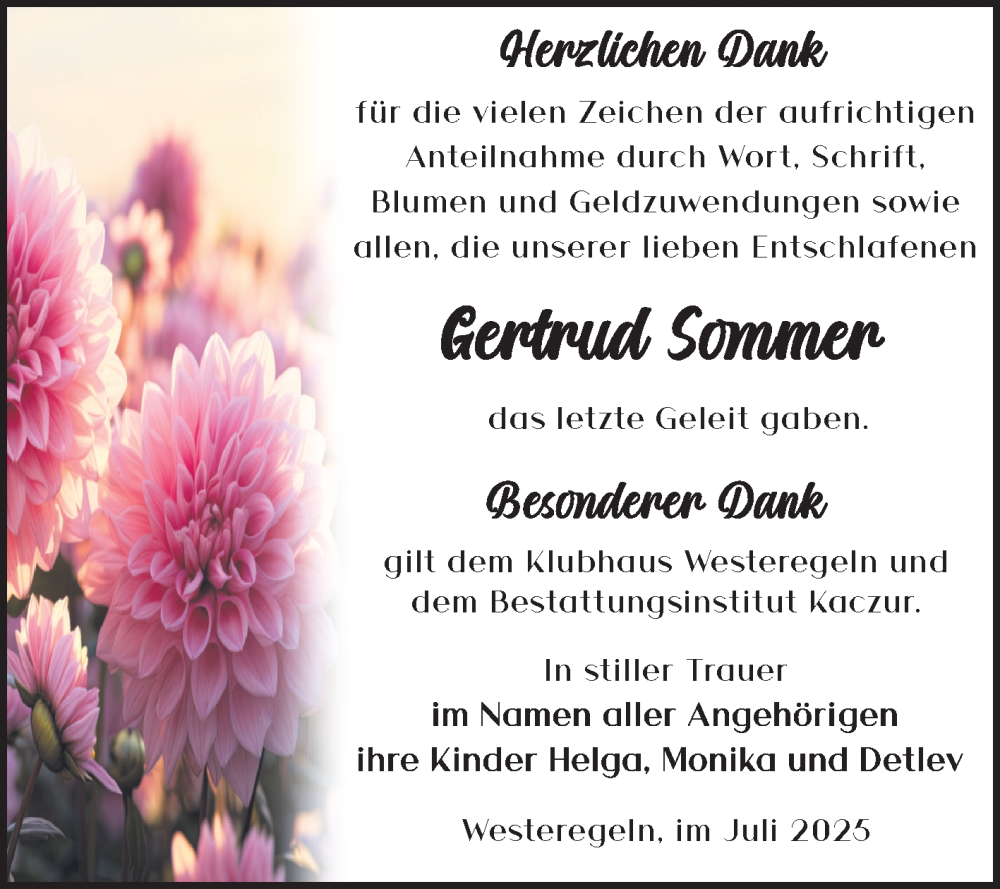 Hier finden Sie alle Traueranzeigen aus der Zeitung, die bisher für Gertrud Sommer erschienen sind. Weitere Traueranzeigen, die in der Zeitung erscheinen, werden hier ebenfalls aufgelistet