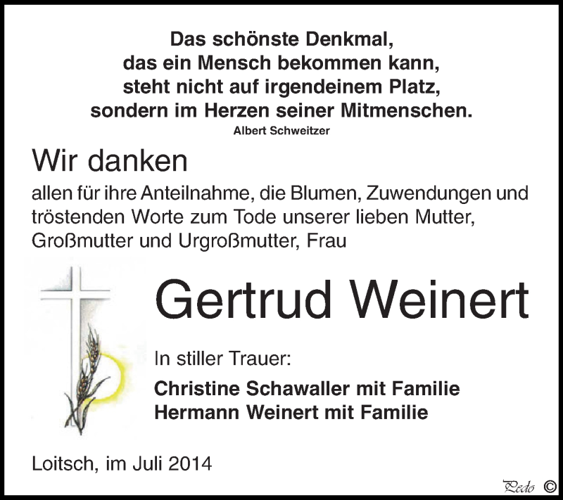 Hier finden Sie alle Traueranzeigen aus der Zeitung, die bisher für Gertrud Weinert erschienen sind. Weitere Traueranzeigen, die in der Zeitung erscheinen, werden hier ebenfalls aufgelistet