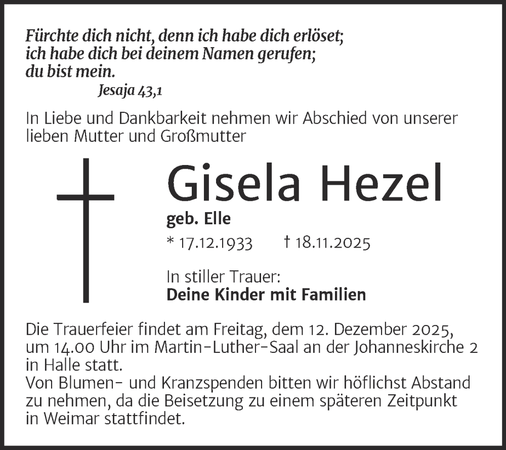 Hier finden Sie alle Traueranzeigen aus der Zeitung, die bisher für Gisela Hezel erschienen sind. Weitere Traueranzeigen, die in der Zeitung erscheinen, werden hier ebenfalls aufgelistet