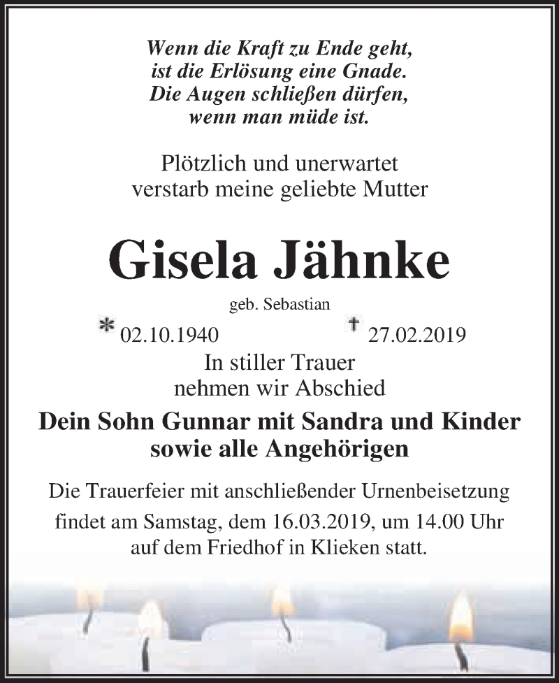 Hier finden Sie alle Traueranzeigen aus der Zeitung, die bisher für Gisela Jähnke erschienen sind. Weitere Traueranzeigen, die in der Zeitung erscheinen, werden hier ebenfalls aufgelistet