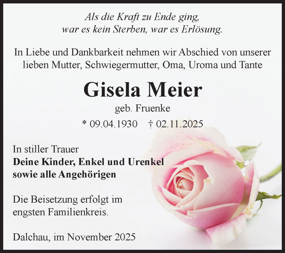 Hier finden Sie alle Traueranzeigen aus der Zeitung, die bisher für Gisela Meier erschienen sind. Weitere Traueranzeigen, die in der Zeitung erscheinen, werden hier ebenfalls aufgelistet