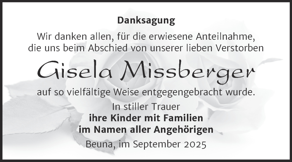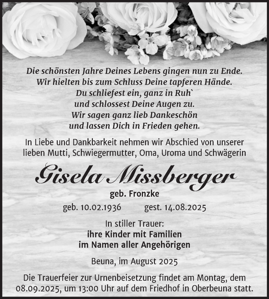Hier finden Sie alle Traueranzeigen aus der Zeitung, die bisher für Gisela Missberger erschienen sind. Weitere Traueranzeigen, die in der Zeitung erscheinen, werden hier ebenfalls aufgelistet
