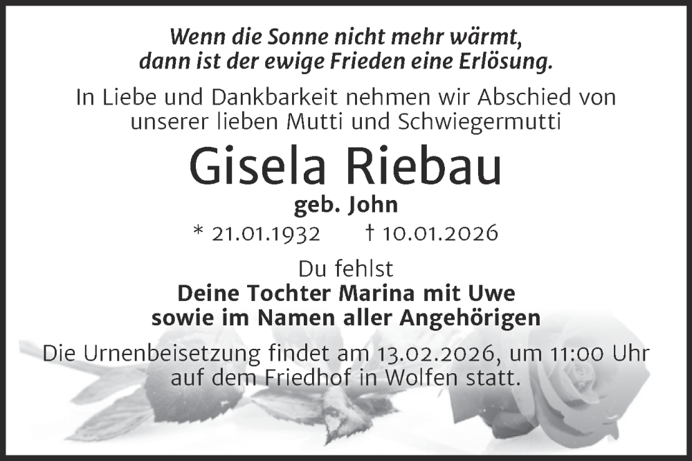 Hier finden Sie alle Traueranzeigen aus der Zeitung, die bisher für Gisela Riebau erschienen sind. Weitere Traueranzeigen, die in der Zeitung erscheinen, werden hier ebenfalls aufgelistet