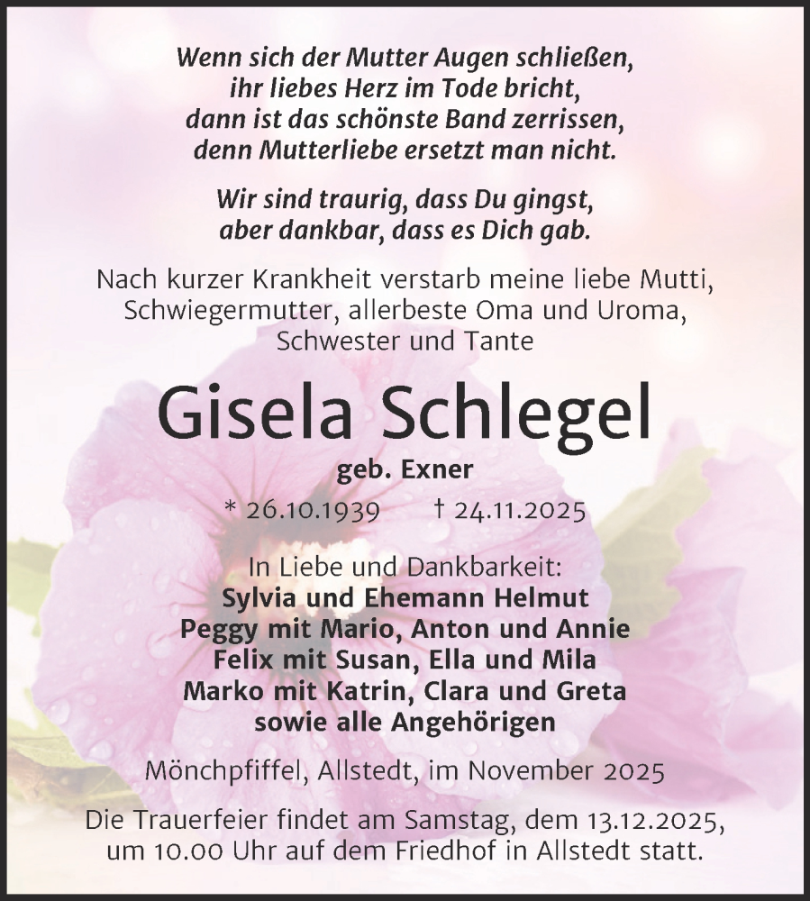 Hier finden Sie alle Traueranzeigen aus der Zeitung, die bisher für Gisela Schlegel erschienen sind. Weitere Traueranzeigen, die in der Zeitung erscheinen, werden hier ebenfalls aufgelistet