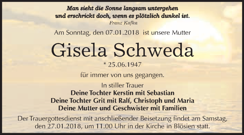 Hier finden Sie alle Traueranzeigen aus der Zeitung, die bisher für Gisela Schweda erschienen sind. Weitere Traueranzeigen, die in der Zeitung erscheinen, werden hier ebenfalls aufgelistet