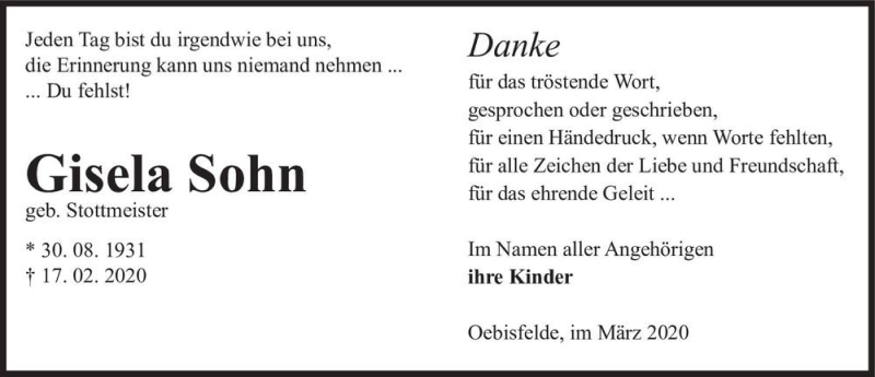 Hier finden Sie alle Traueranzeigen aus der Zeitung, die bisher für Gisela Sohn (geb. Stottmeister) erschienen sind. Weitere Traueranzeigen, die in der Zeitung erscheinen, werden hier ebenfalls aufgelistet