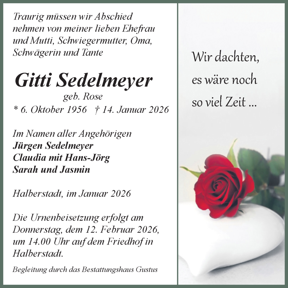 Hier finden Sie alle Traueranzeigen aus der Zeitung, die bisher für Gitti Sedelmeyer erschienen sind. Weitere Traueranzeigen, die in der Zeitung erscheinen, werden hier ebenfalls aufgelistet