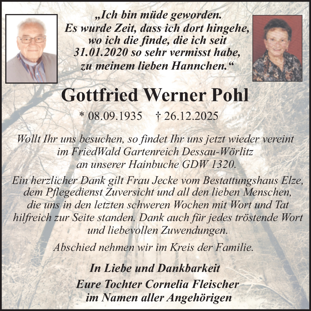Hier finden Sie alle Traueranzeigen aus der Zeitung, die bisher für Gottfried Werner Pohl erschienen sind. Weitere Traueranzeigen, die in der Zeitung erscheinen, werden hier ebenfalls aufgelistet