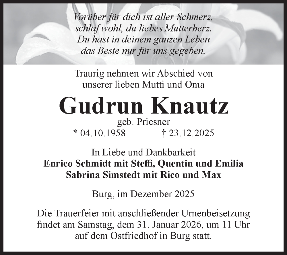 Hier finden Sie alle Traueranzeigen aus der Zeitung, die bisher für Gudrun Knautz erschienen sind. Weitere Traueranzeigen, die in der Zeitung erscheinen, werden hier ebenfalls aufgelistet