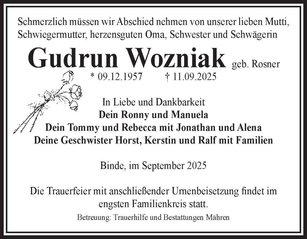 Hier finden Sie alle Traueranzeigen aus der Zeitung, die bisher für Gudrun Wozniak erschienen sind. Weitere Traueranzeigen, die in der Zeitung erscheinen, werden hier ebenfalls aufgelistet
