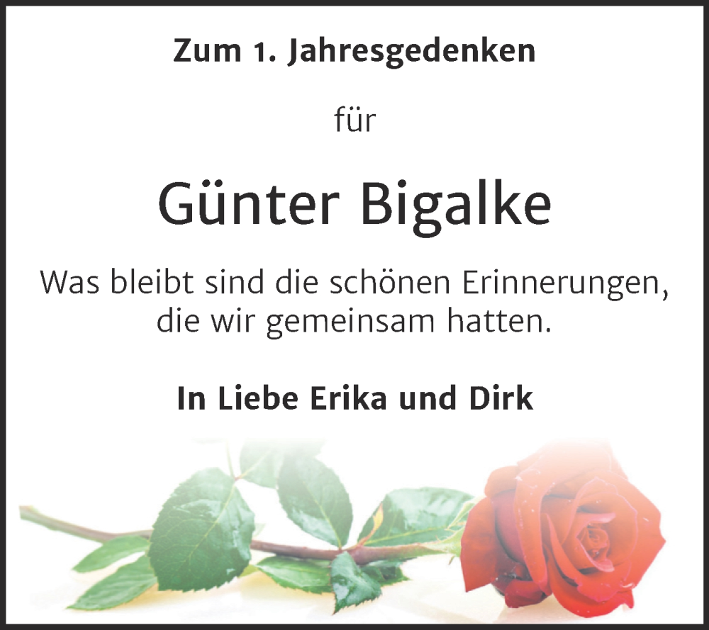 Hier finden Sie alle Traueranzeigen aus der Zeitung, die bisher für Günter Bigalke erschienen sind. Weitere Traueranzeigen, die in der Zeitung erscheinen, werden hier ebenfalls aufgelistet