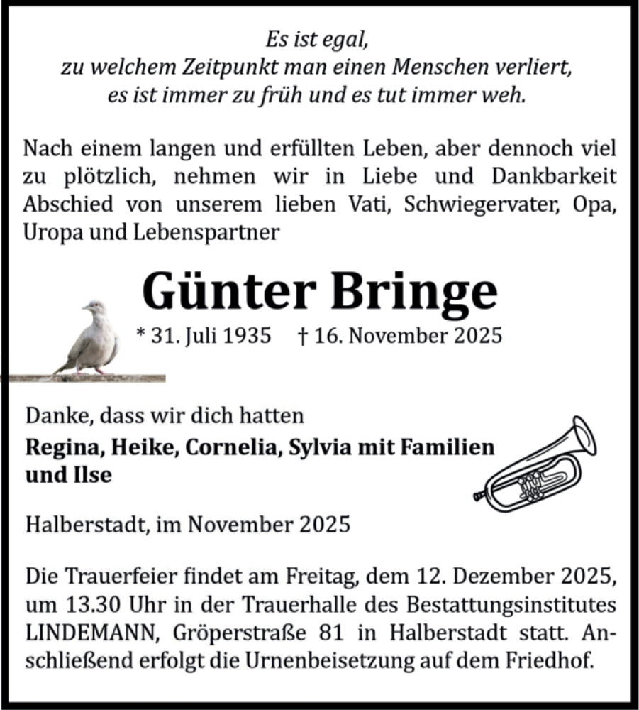 Hier finden Sie alle Traueranzeigen aus der Zeitung, die bisher für Günter Bringe erschienen sind. Weitere Traueranzeigen, die in der Zeitung erscheinen, werden hier ebenfalls aufgelistet