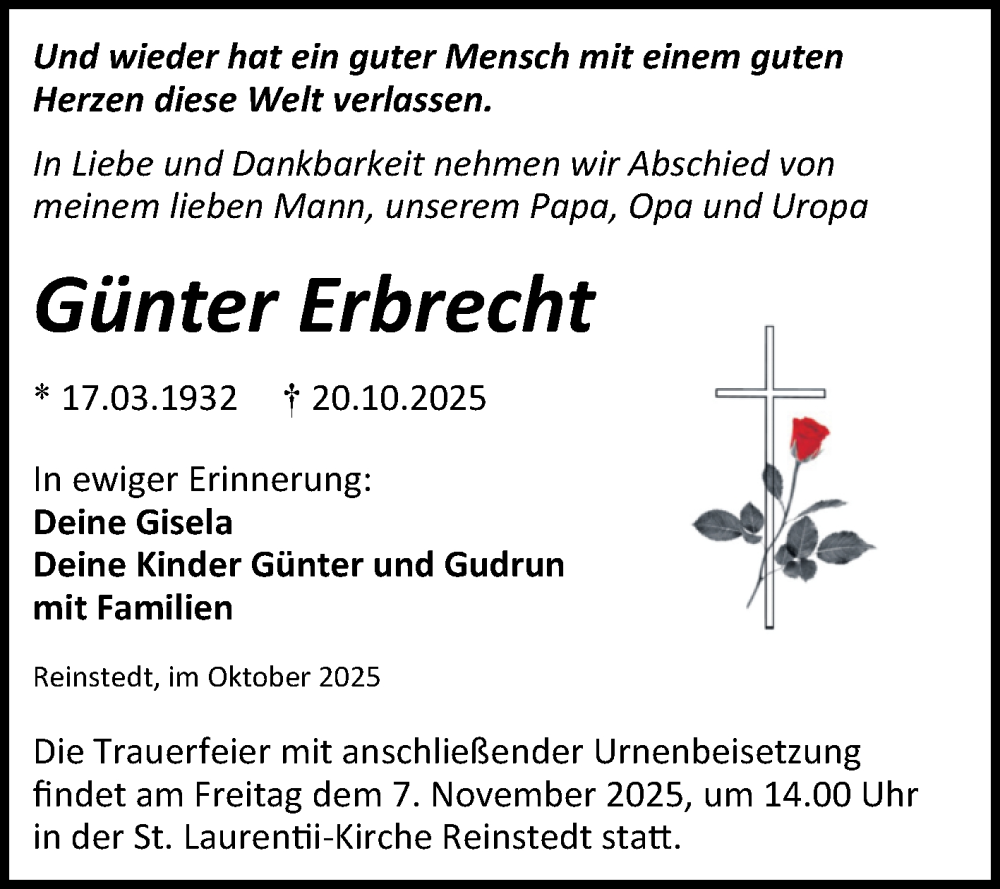 Hier finden Sie alle Traueranzeigen aus der Zeitung, die bisher für Günter Erbrecht erschienen sind. Weitere Traueranzeigen, die in der Zeitung erscheinen, werden hier ebenfalls aufgelistet