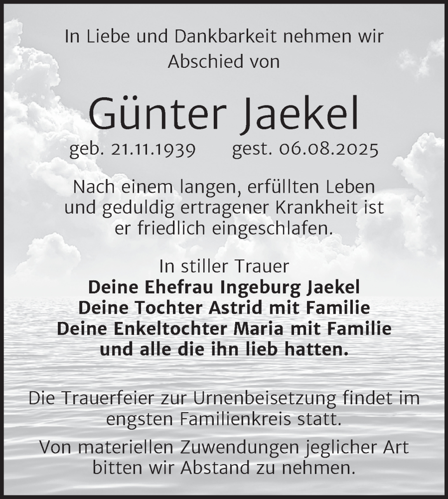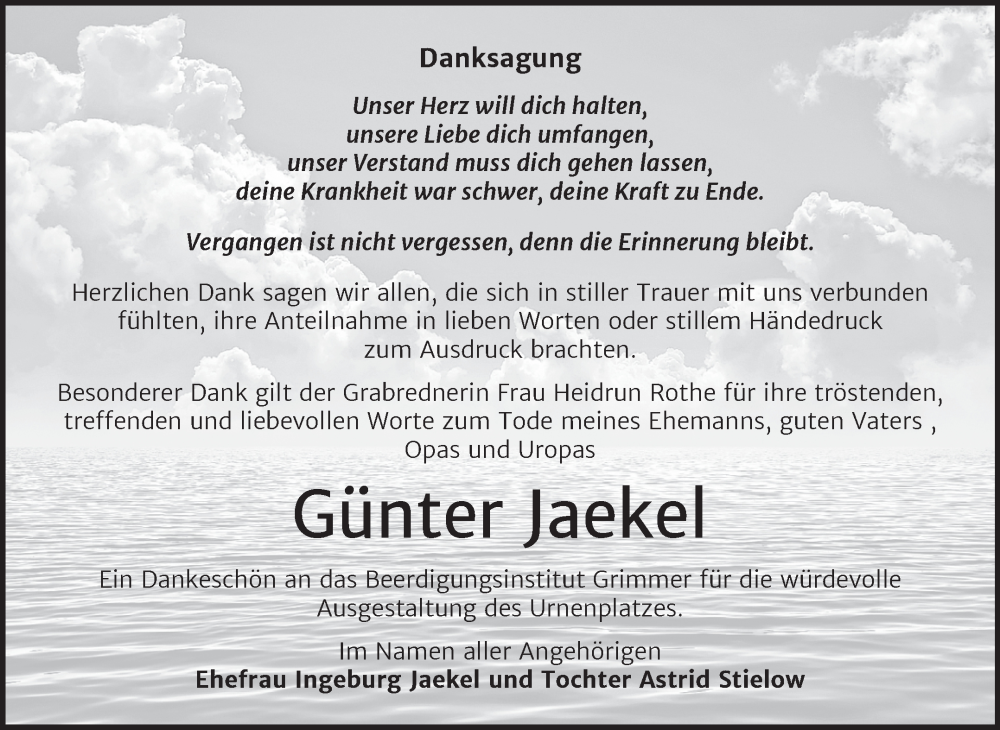Hier finden Sie alle Traueranzeigen aus der Zeitung, die bisher für Günter Jaekel erschienen sind. Weitere Traueranzeigen, die in der Zeitung erscheinen, werden hier ebenfalls aufgelistet