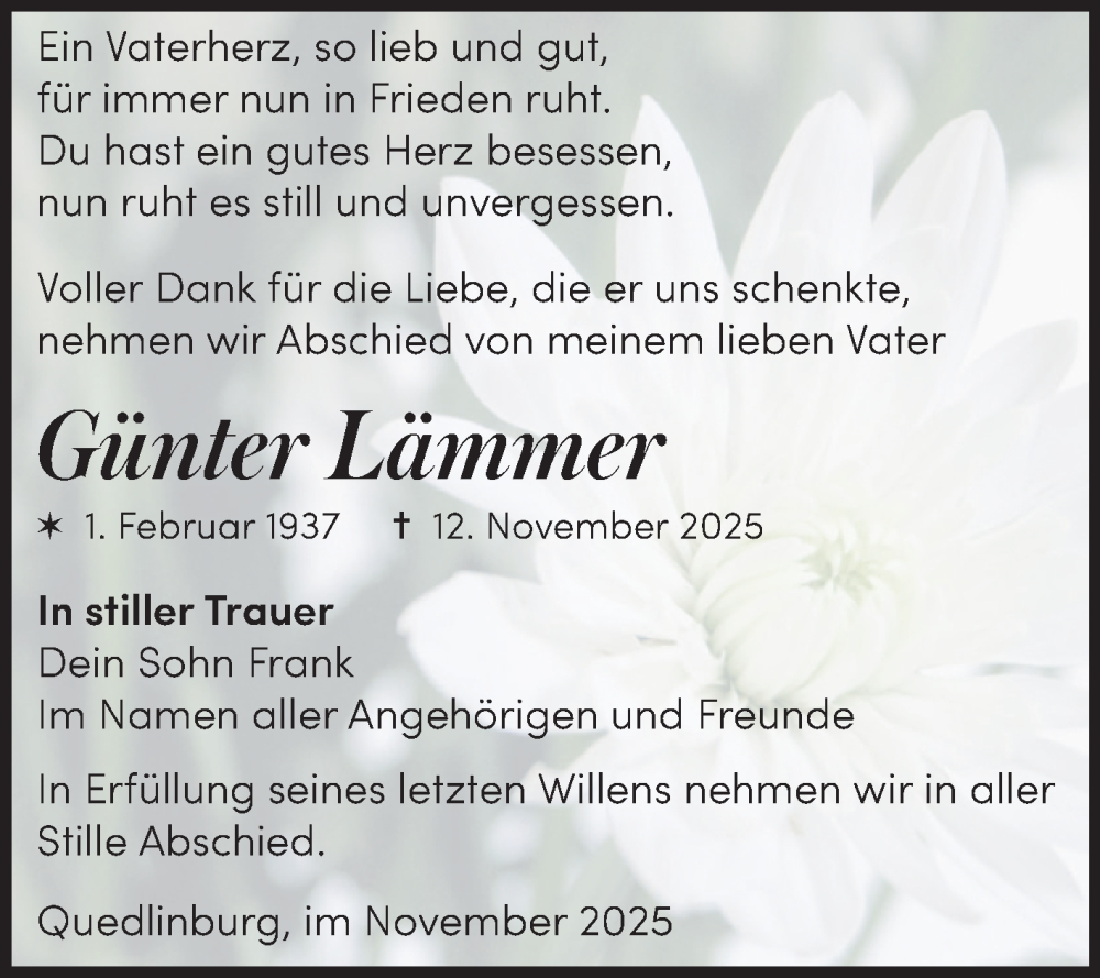 Hier finden Sie alle Traueranzeigen aus der Zeitung, die bisher für Günter Lämmer erschienen sind. Weitere Traueranzeigen, die in der Zeitung erscheinen, werden hier ebenfalls aufgelistet