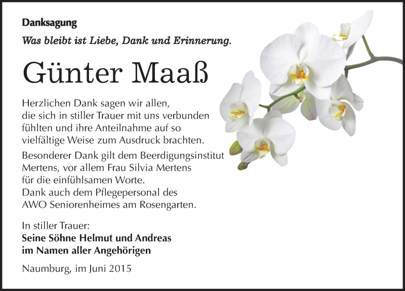 Hier finden Sie alle Traueranzeigen aus der Zeitung, die bisher für Günter Maaß erschienen sind. Weitere Traueranzeigen, die in der Zeitung erscheinen, werden hier ebenfalls aufgelistet