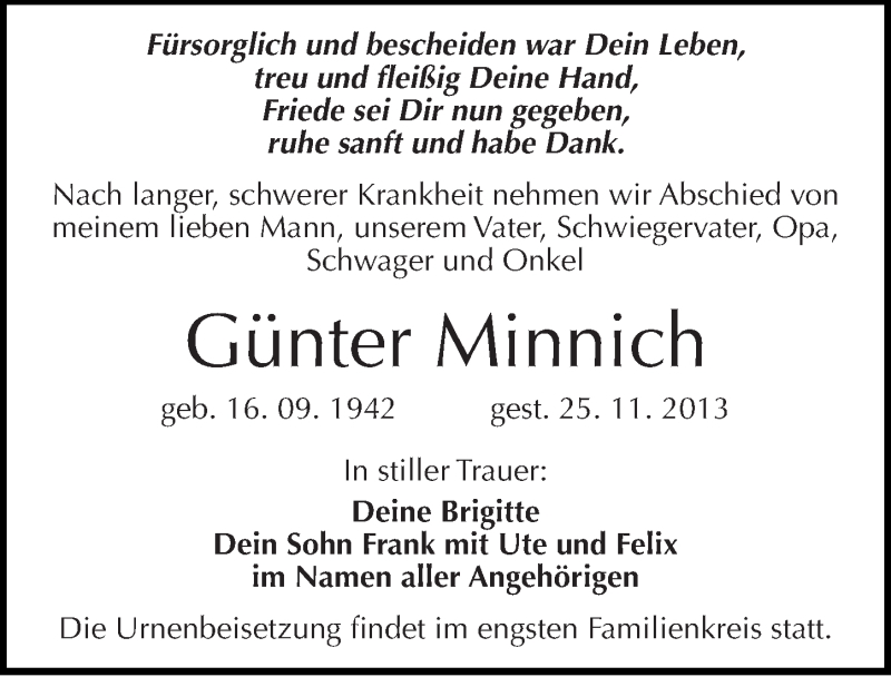 Hier finden Sie alle Traueranzeigen aus der Zeitung, die bisher für Günter Minnich erschienen sind. Weitere Traueranzeigen, die in der Zeitung erscheinen, werden hier ebenfalls aufgelistet