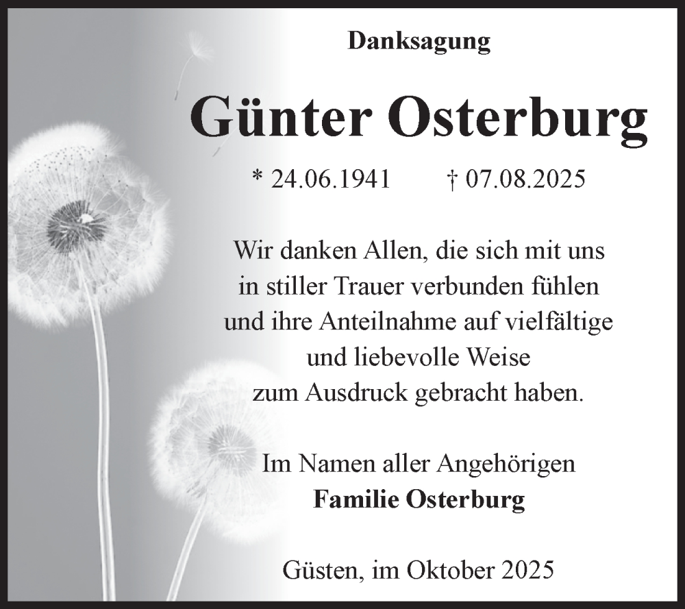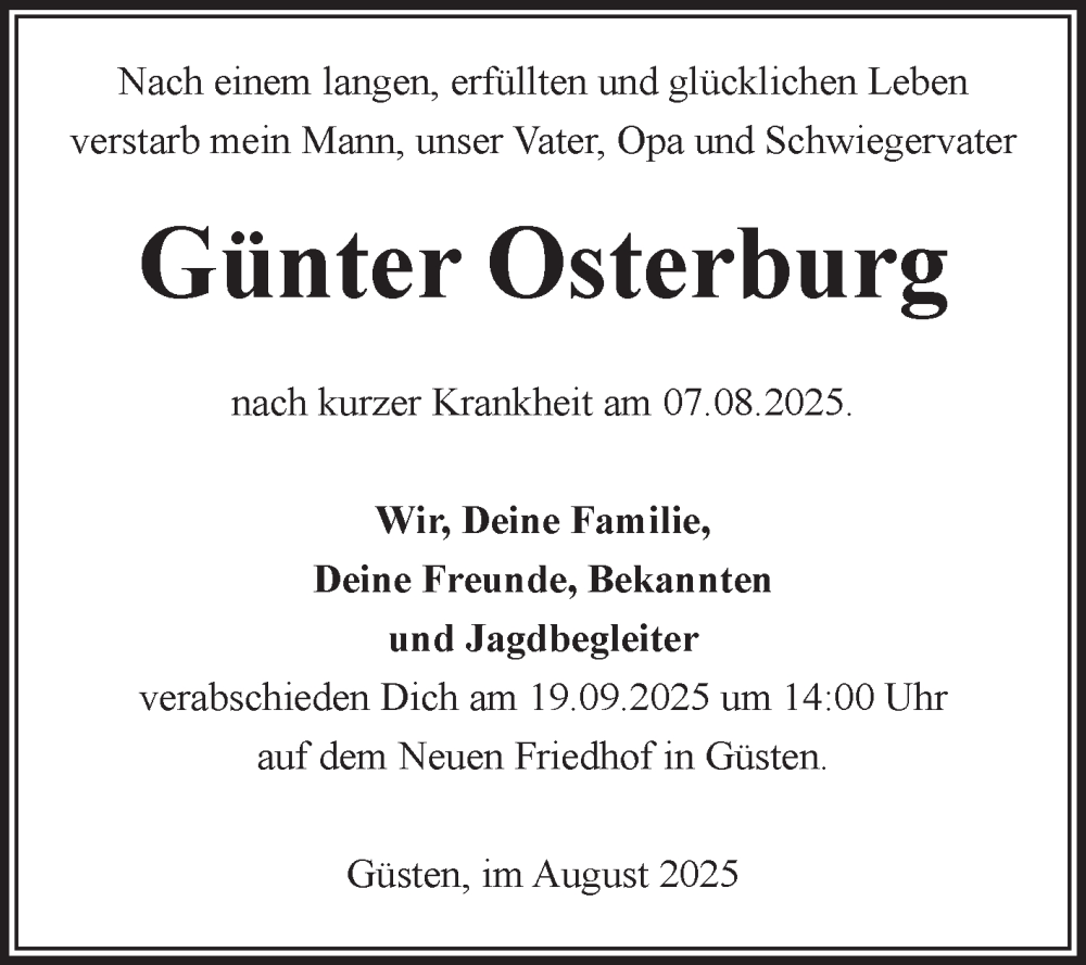 Hier finden Sie alle Traueranzeigen aus der Zeitung, die bisher für Günter Osterburg erschienen sind. Weitere Traueranzeigen, die in der Zeitung erscheinen, werden hier ebenfalls aufgelistet