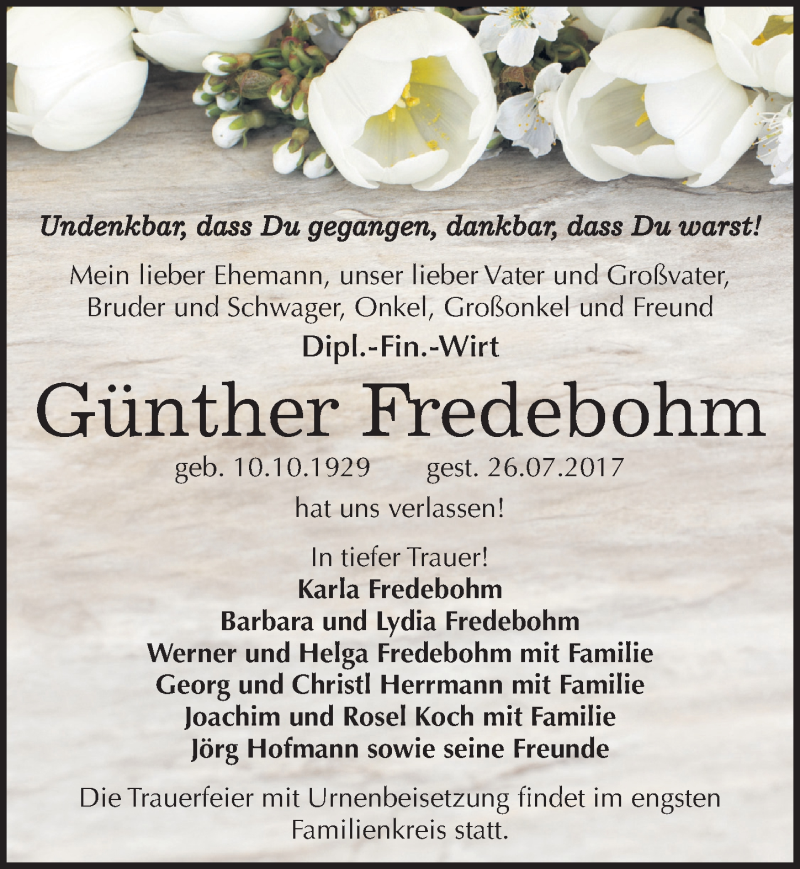 Hier finden Sie alle Traueranzeigen aus der Zeitung, die bisher für Günther Fredebohm erschienen sind. Weitere Traueranzeigen, die in der Zeitung erscheinen, werden hier ebenfalls aufgelistet