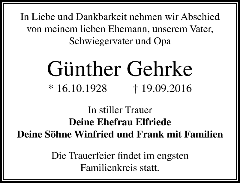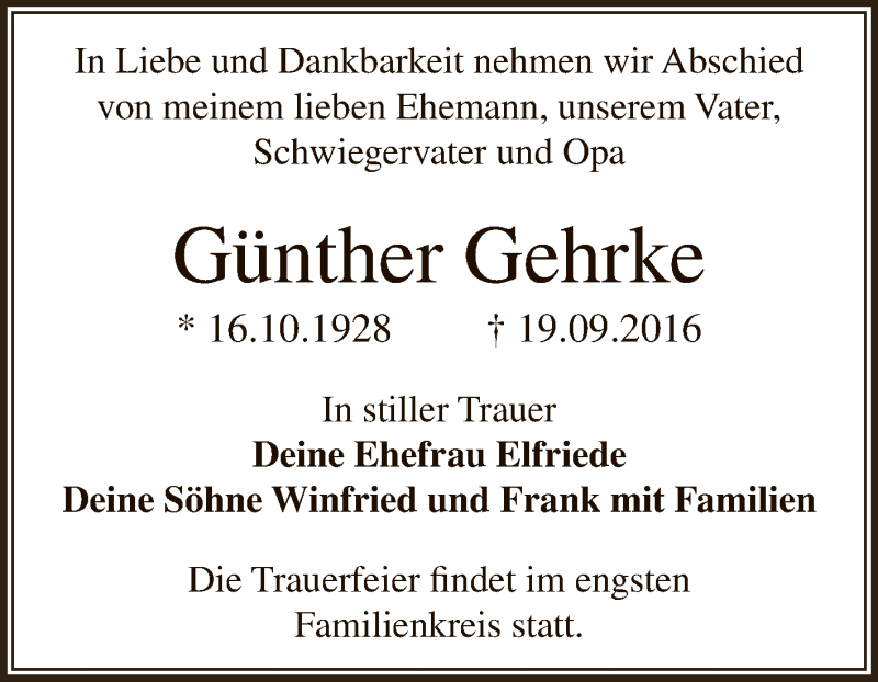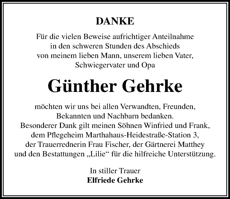 Hier finden Sie alle Traueranzeigen aus der Zeitung, die bisher für Günther Gehrke erschienen sind. Weitere Traueranzeigen, die in der Zeitung erscheinen, werden hier ebenfalls aufgelistet