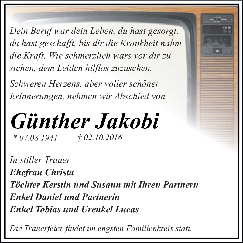 Hier finden Sie alle Traueranzeigen aus der Zeitung, die bisher für Günther Jakobi erschienen sind. Weitere Traueranzeigen, die in der Zeitung erscheinen, werden hier ebenfalls aufgelistet