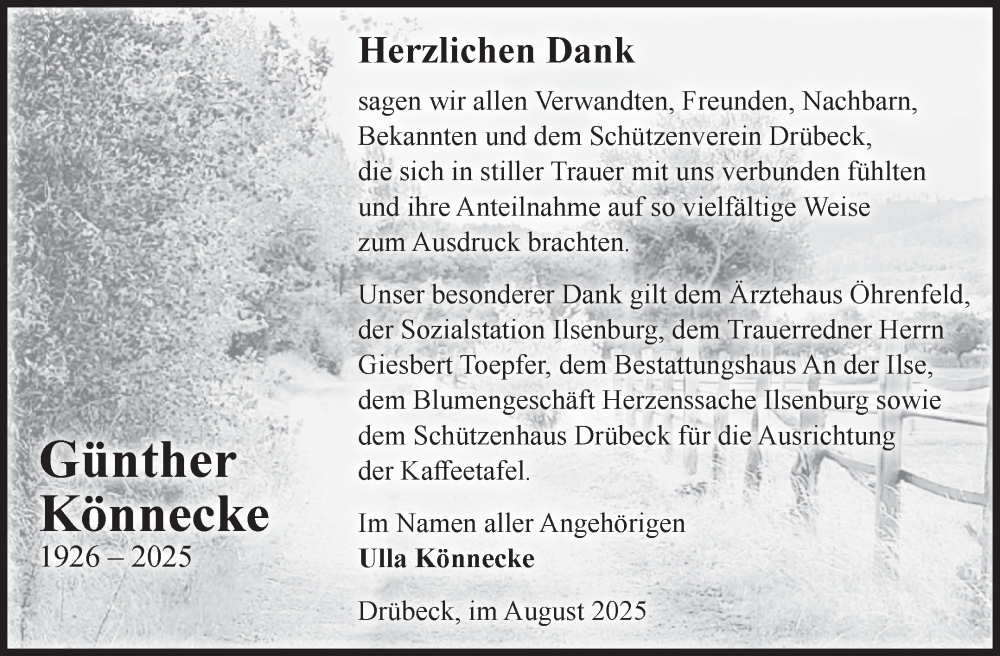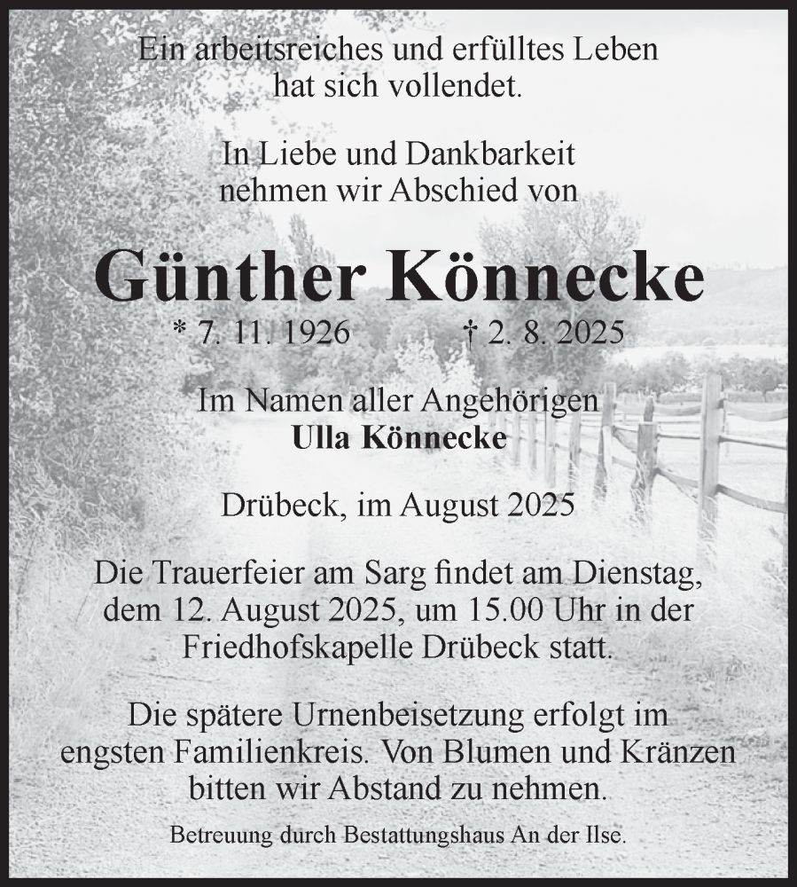 Hier finden Sie alle Traueranzeigen aus der Zeitung, die bisher für Günther Könnecke erschienen sind. Weitere Traueranzeigen, die in der Zeitung erscheinen, werden hier ebenfalls aufgelistet