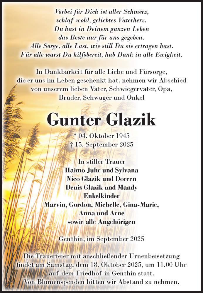 Hier finden Sie alle Traueranzeigen aus der Zeitung, die bisher für Gunter Glazik erschienen sind. Weitere Traueranzeigen, die in der Zeitung erscheinen, werden hier ebenfalls aufgelistet