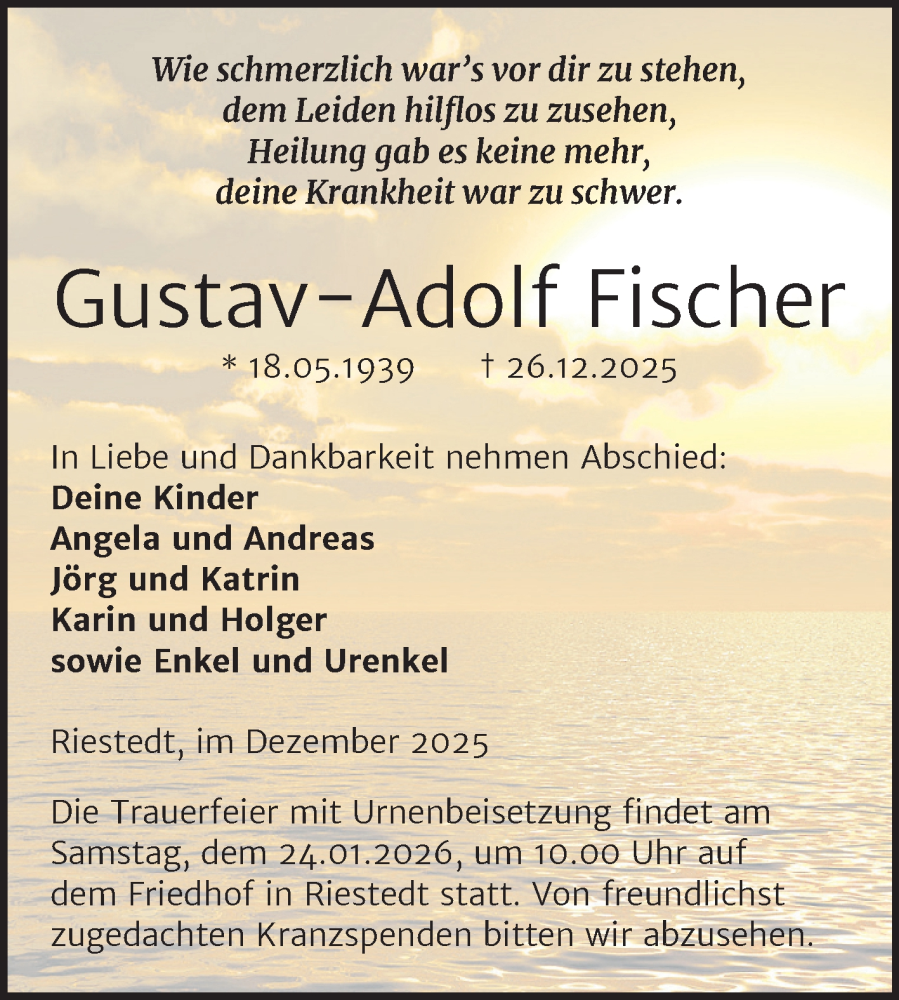 Hier finden Sie alle Traueranzeigen aus der Zeitung, die bisher für Gustav-Adolf Fischer erschienen sind. Weitere Traueranzeigen, die in der Zeitung erscheinen, werden hier ebenfalls aufgelistet