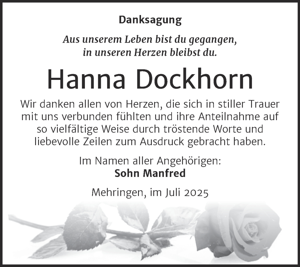Hier finden Sie alle Traueranzeigen aus der Zeitung, die bisher für Hanna Dockhorn erschienen sind. Weitere Traueranzeigen, die in der Zeitung erscheinen, werden hier ebenfalls aufgelistet