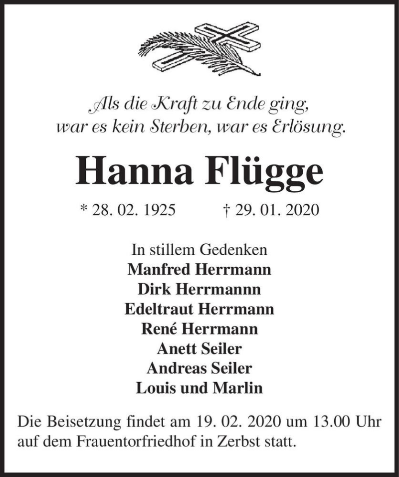Hier finden Sie alle Traueranzeigen aus der Zeitung, die bisher für Hanna Flügge erschienen sind. Weitere Traueranzeigen, die in der Zeitung erscheinen, werden hier ebenfalls aufgelistet
